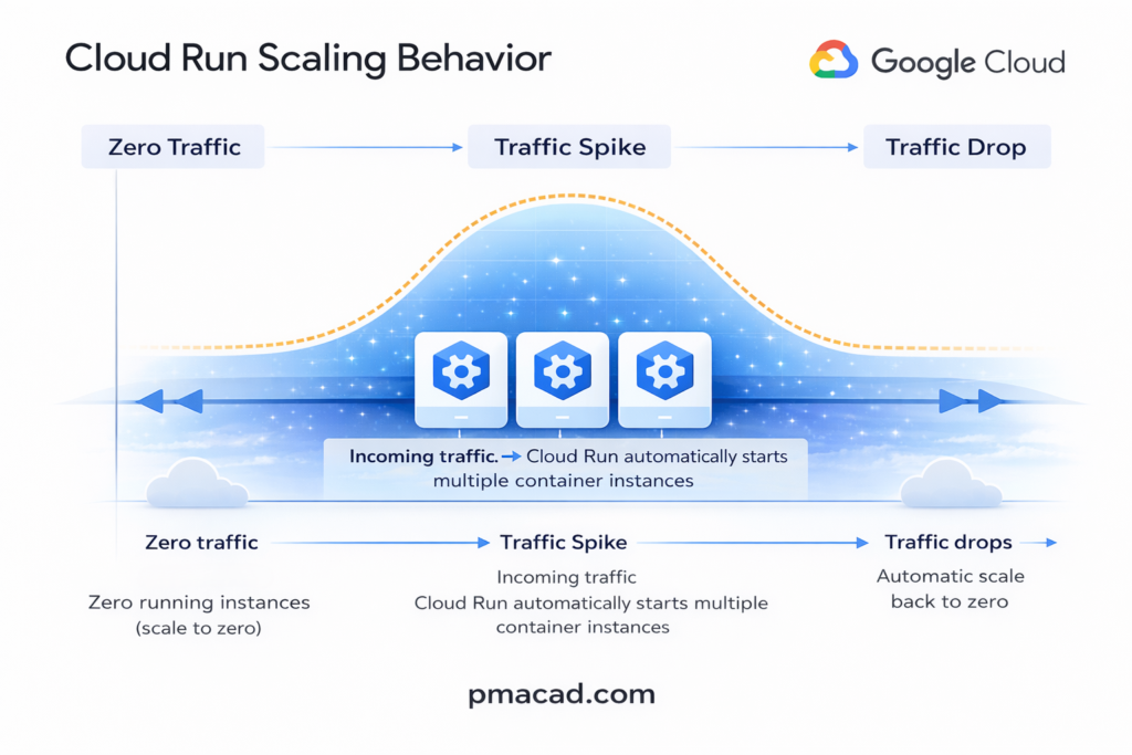 One of Cloud Run’s defining characteristics is scale-to-zero. When no requests are being processed, Cloud Run can reduce the number of running instances to zero, meaning there is no cost for idle resources. When traffic returns, new instances are started automatically. This behavior makes Cloud Run especially cost-effective for applications with intermittent or unpredictable traffic patterns.