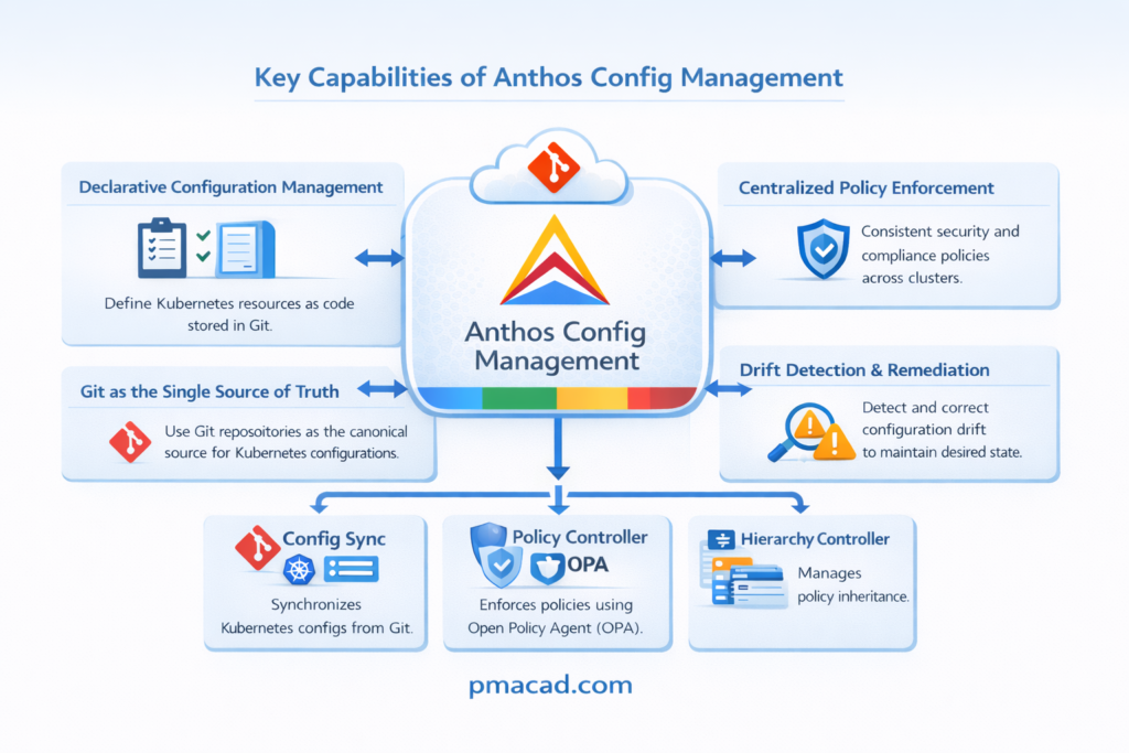 Anthos Config Management is a governance and configuration service that enables organizations to manage Kubernetes configurations and policies consistently across multiple clusters and environments. It follows a GitOps-based model, where configuration files stored in a Git repository act as the single source of truth.